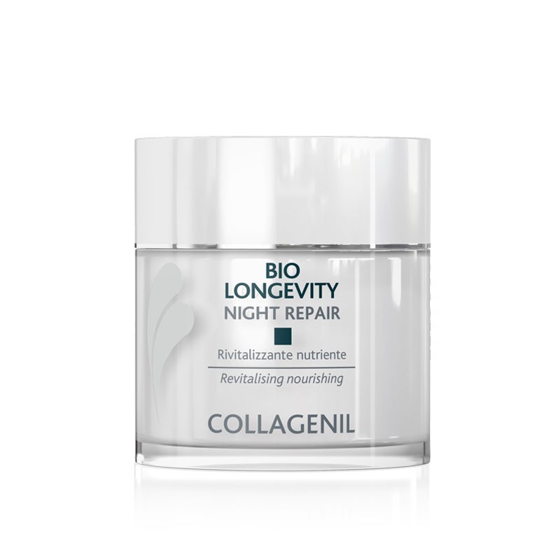 La formulazione cosmeceutica specifica notte dei Laboratori Collagenil agisce unendo sinergicamente un’azione biostimolante ad una rivitalizzante. La prima viene esplicata da due peptidi di ultima generazione: Dermican che agisce stimolando la produzione di collagene-I, rendendo così la pelle più compatta, ristrutturata e soda. Syniorage che contemporaneamente catalizza la concentrazione di Syndecan-I aumentando la coesione epidermica e svolgendo il ruolo di “collante” ed elasticizzante.