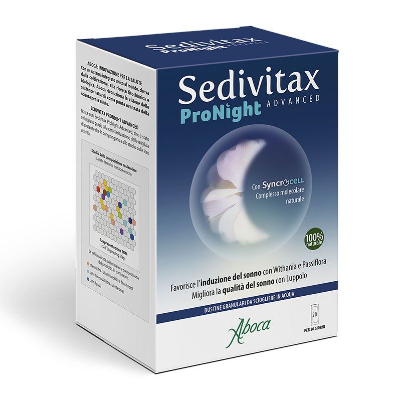 Sedivitax ProNight Advanced è un prodotto 100% naturale nato dalle avanzate piattaforme scientifiche della Ricerca Aboca che hanno permesso di sviluppare l’innovativo complesso molecolare Syncrocell ricco in flavonoidi e withanolidi, composti naturalmente presenti in Passiflora, Luppolo e Withania.